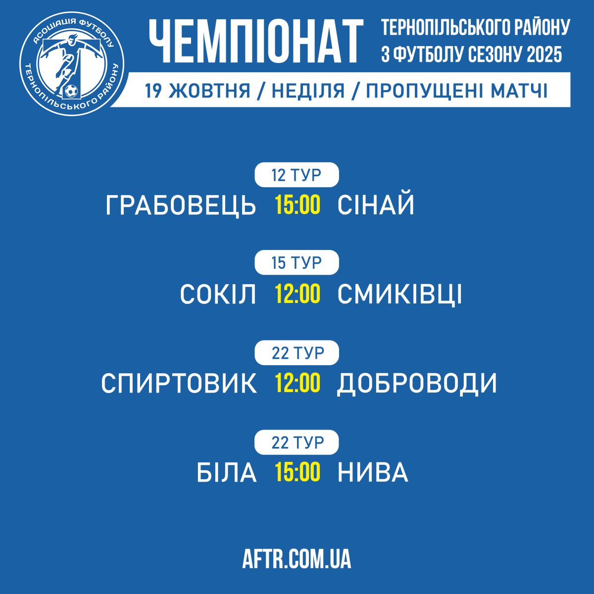 Підходить до завершення Чемпіонат Тернопільського району з футболу у Першій лізі. У неділю, 19 жовтня, відбудеться ряд пропущених матчів: Всі інші команди - відпочивають.