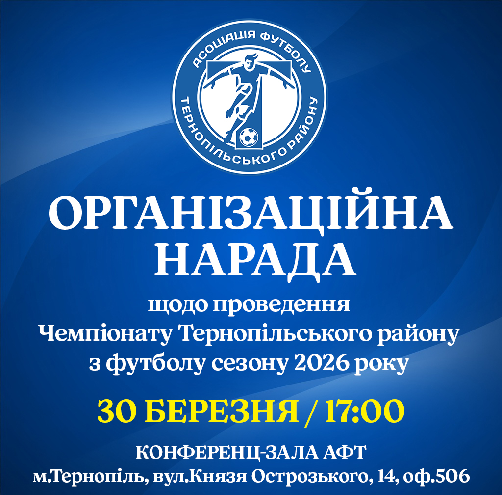 🟦 У понеділок, 30 березня, відбудеться організаційна нарада щодо проведення Чемпіонату Тернопільського району з футболу сезону 2026 року. 📍 Конференц-зала Асоціації футболу Тернопільщини ▶️ Початок о 17:00